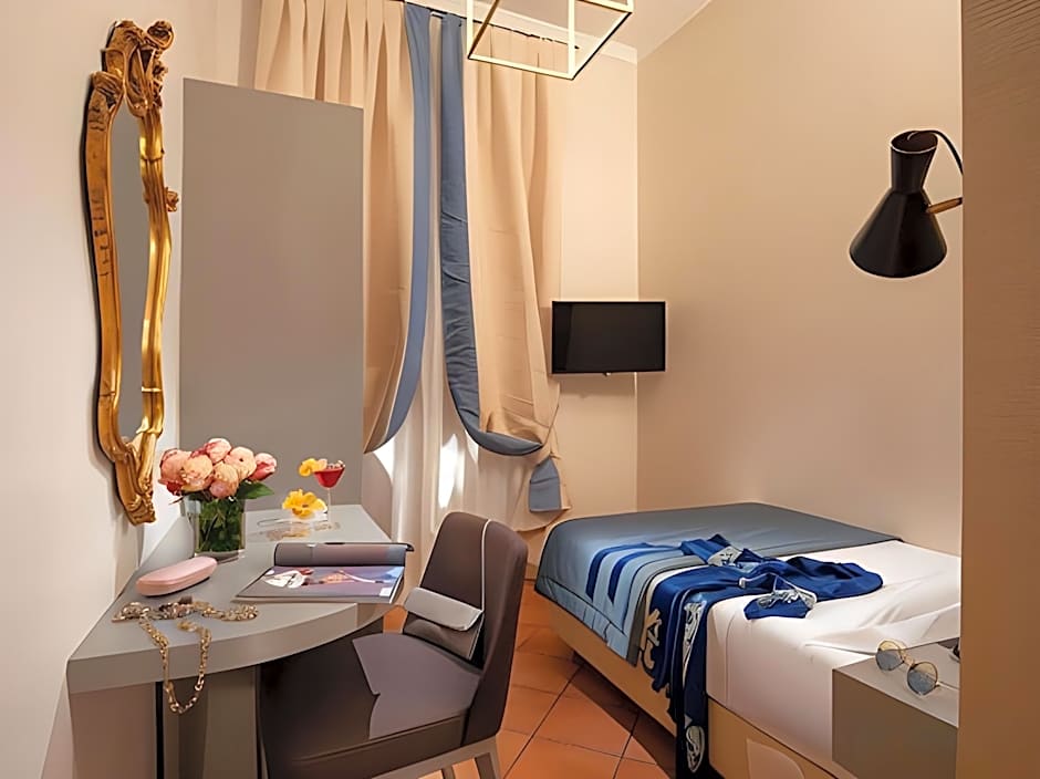 Annex room in separate building - via del corso 75 is 323 square feet and includes a queen-size bed 150-154 width plus a sofa bed and rollaways on demand plus desk, hairdryer, and safe.